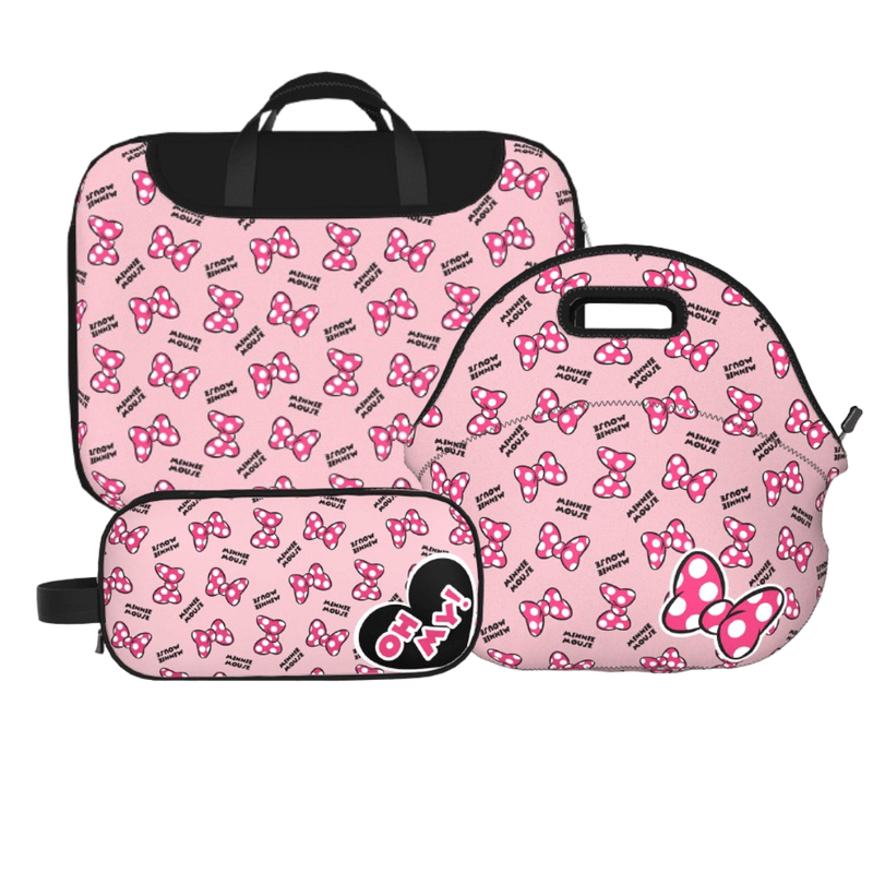 La Funda para Portátil Puff Printing Minnie Mouse Rosado combina estilo y protección para tu portátil. Con un diseño encantador de Minnie Mouse en un vibrante tono rosado, esta funda es perfecta para mantener tu dispositivo seguro y a la moda. + Cartuchera Puff Printing 2 Bolsillos Minnie Mouse Rosado es ideal para organizar tus artículos con estilo y comodidad. Con sus dos bolsillos y el diseño encantador de Minnie Mouse en rosado, es perfecta para llevar todo lo que necesitas. + La Lonchera Térmica Minnie Mouse Pink es perfecta para mantener tus alimentos frescos y deliciosos mientras te acompaña con un diseño encantador. Con su elegante color rosa y la imagen icónica de Minnie, será tu compañera ideal en todo momento.