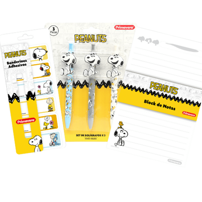 Block de Notas Snoopy, donde cada página es un lienzo para tu creatividad. Deja que el adorable Snoopy te inspire a soñar en grande y anotar cada pensamiento brillante. + Set Banderines Adhesivos Snoopy. Estos adorables banderines te acompañarán en cada tarea, haciendo que tus recordatorios sean irresistibles. + Set de Bolígrafos + Rubber Snoopy X 3, donde cada trazo es un viaje a la diversión. Con el inconfundible estilo de Snoopy, estos bolígrafos son perfectos para darle un toque especial a tus notas