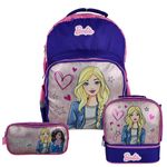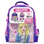 Dentro de cada Combo Premium Barbie Grande 3 en 1 se encuentra un morral grande con personaje principal en relieve, asas superiores, cargaderas acolchadas, cintas reflectivas, bolsillos laterales de malla y espacios para marcado, todo elaborado en material 100% poliéster con puller metálico. Además, incluye una lonchera premium con impresión de alta calidad, forro interno 100% PEVA, aislamiento térmico, compartimentos funcionales y accesorios como cinchas de nailon y cremalleras con puller metálico. Para completar el conjunto, la cartuchera de dos bolsillos ofrece impresión de alta calidad, cierre de cremallera, asa lateral y materiales duraderos, garantizando un conjunto completo y elegante.