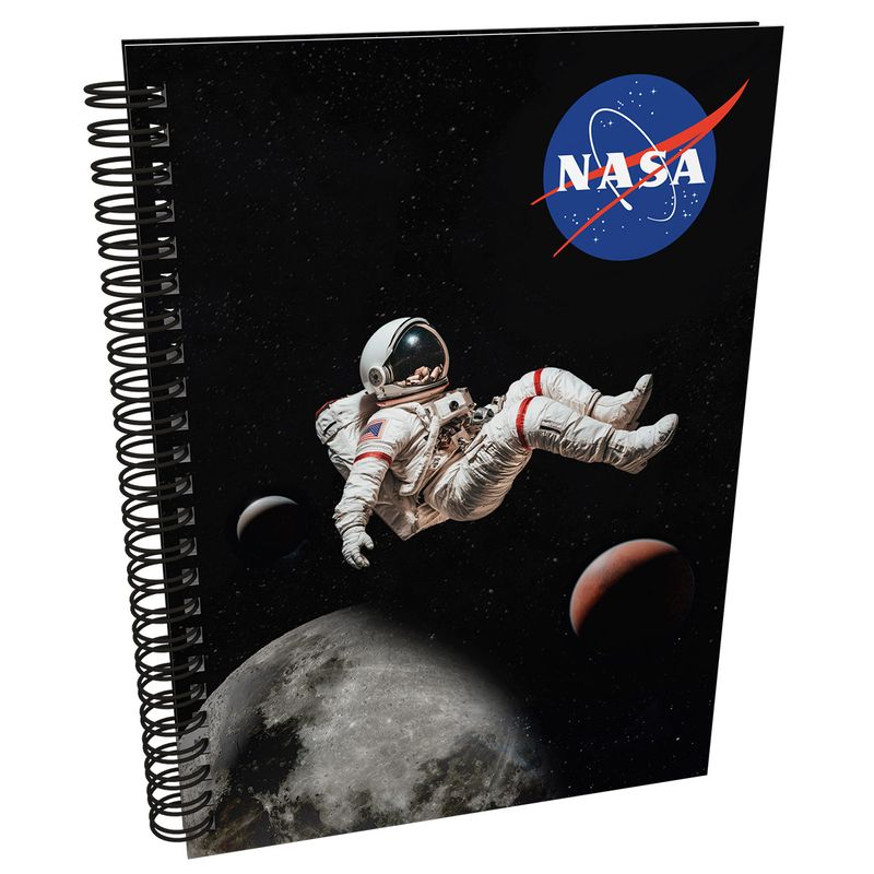 El Cuaderno Argollado Pasta Dura NASA Grande Astronauta incluye pasta dura resistente, argollado doble O de color y acabados premium como plastificado matte, metalizado y brillo UV. Un producto 100% original NASA.