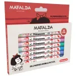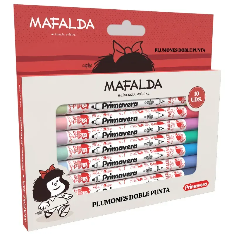 - Plumón Doble Punta Mafalda (X10): Versatilidad total para tus apuntes. Una punta fina para detalles precisos y una punta pincel para destacar. 10 colores vibrantes para que nada sea monótono.