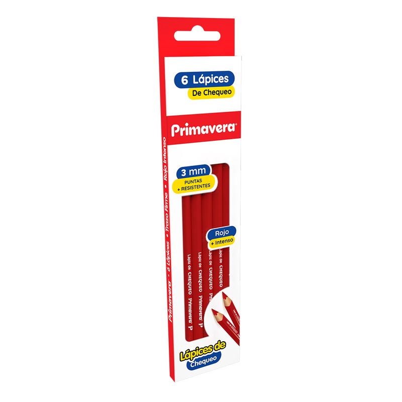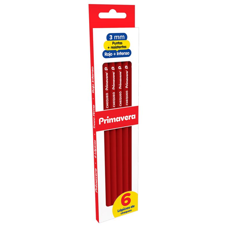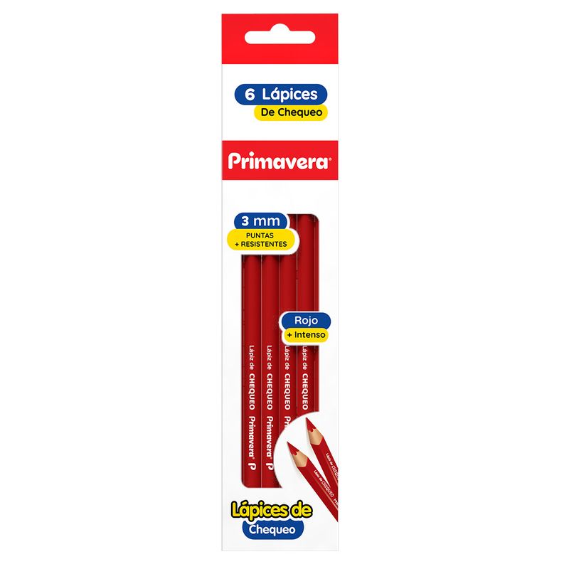 Lápiz de Chequeo Rojo Primavera x 6: Este set de lápices de color rojo intenso es ideal para realizar chequeos y subrayados en tus trabajos escolares. Con un cuerpo triangular que facilita su agarre y una punta de 3 mm más resistente, podrás disfrutar de un trazo firme y preciso en cada uso. Además, su mina gruesa garantiza una mayor resistencia, lo que te permitirá utilizarlos por mucho más tiempo.